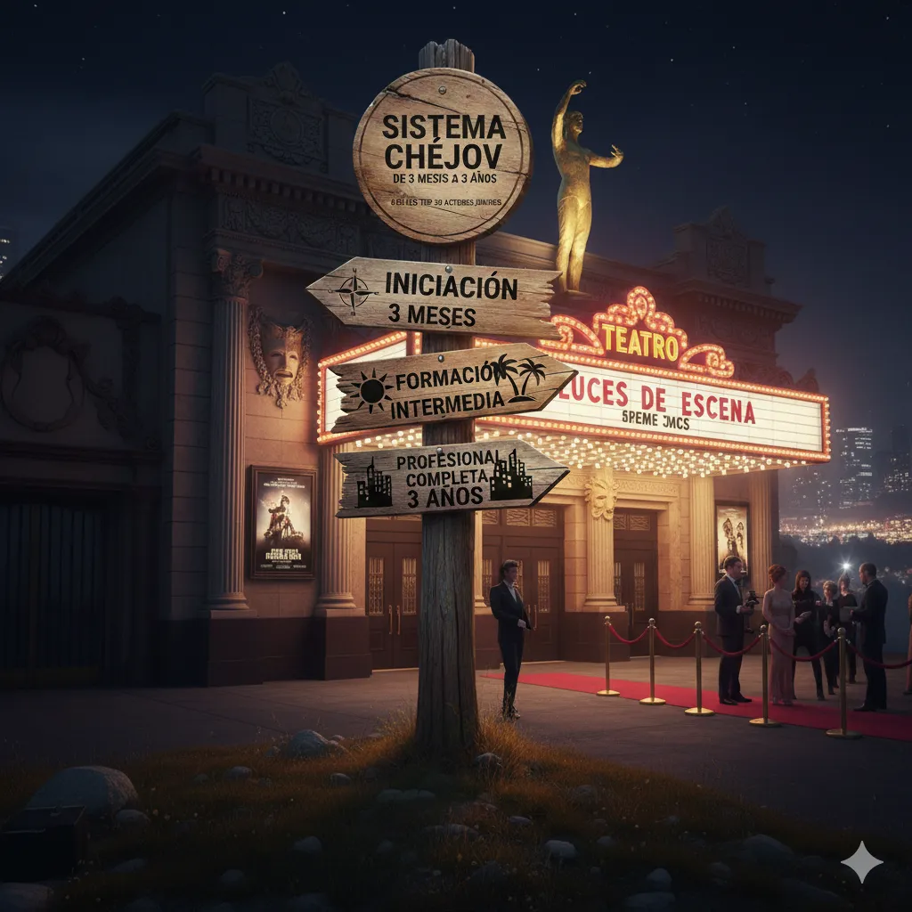 Tres años de Sistema Chéjov completo que te transforman de estudiante a actor profesional con producción ante industria, conexiones directas con directores de casting, y seguimiento psicopedagógico constante.
